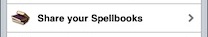 Tap Share your Spellbooks in the Spellbooks screen to share all your spellbooks with other SpellbookMaster users that are connected to the same Wi-Fi network. You must be in this screen for others to download spells from your iPhone.